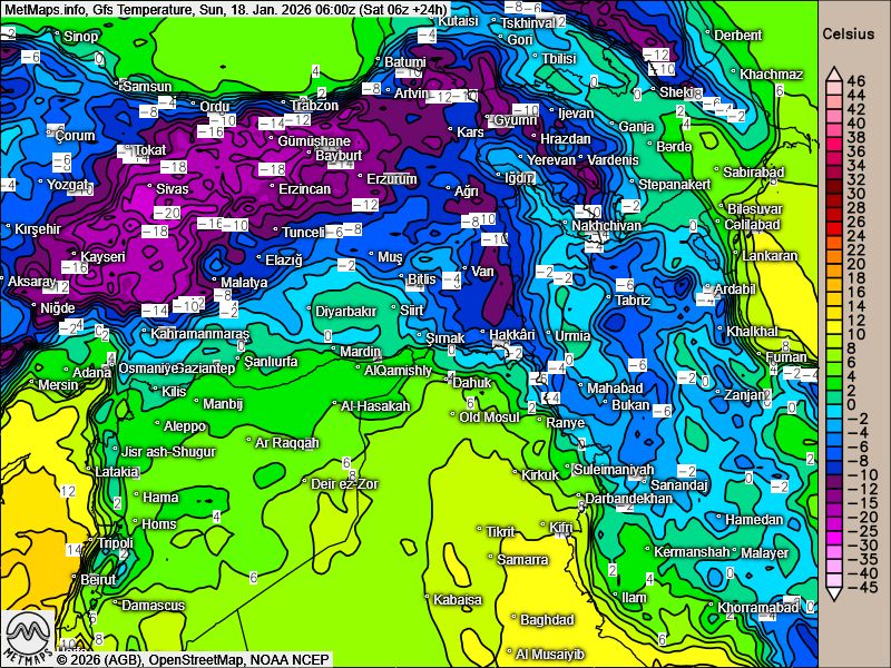 Frühtemperaturen Naher Osten am 18.01.2026 (06:00 Uhr)