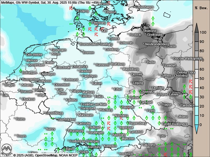 Der ehemalige Wirbelsturm "Erin" begleitet uns als steuerndes Tiefdruckgebiet auch ins Wochenende. Heute sind am Nachmittag einzelne Schauer und Gewitter unterwegs: