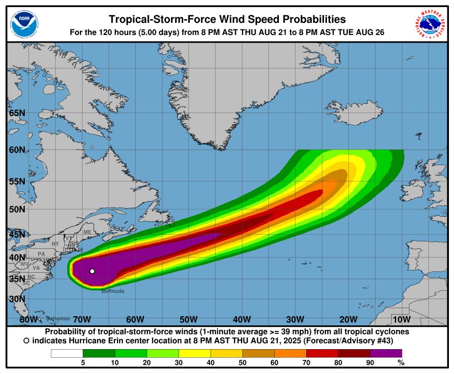 Am Wochenende zieht der Ex-Wirbelsturm "Erin" über den Atlantik und wandelt sich in ein normales Tiefdruckgebiet um: