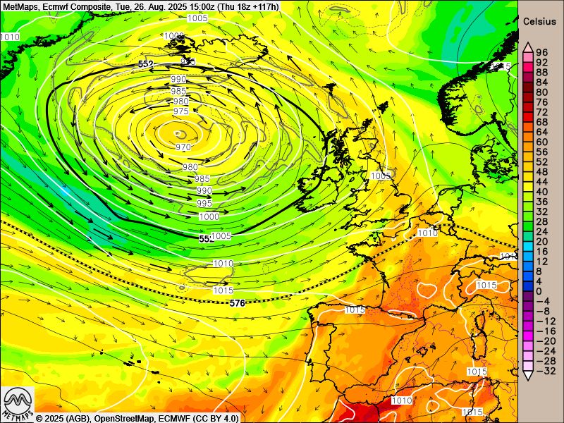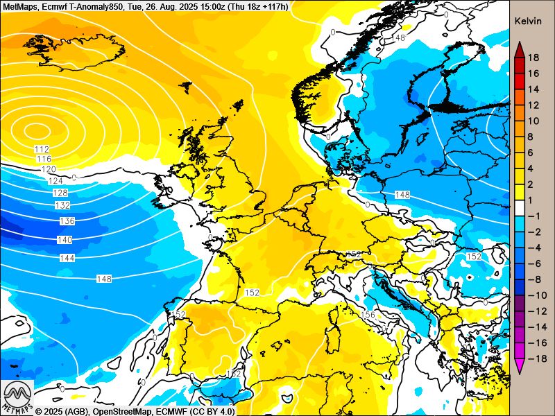 Die Strömungskarte nach sowie die Temperaturanomalie am Dienstagnachmittag (26.08.) nach ECMWF.