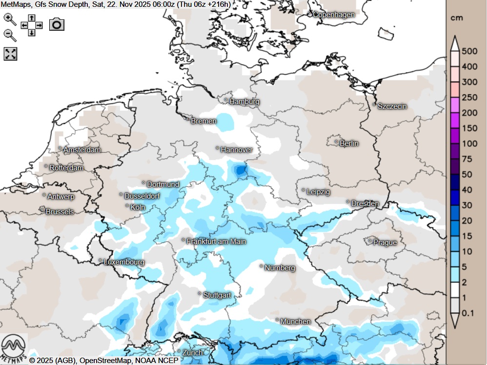 Die Lufttemperaturen für Donnerstagabend (20.11.) sowie die Schneehöhen am übernächsten Samstag (22.11.) nach GFS:
