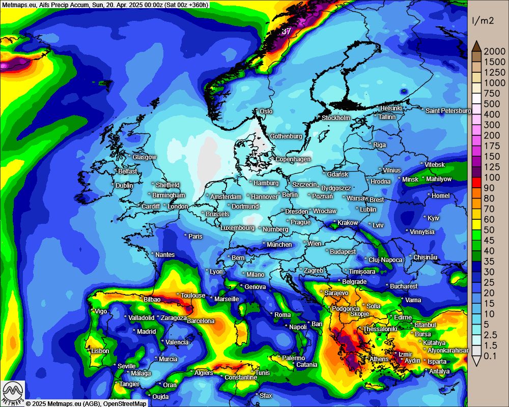 Gesamtregenmengen Europa bis zum 20.04.2025 (AIFS)