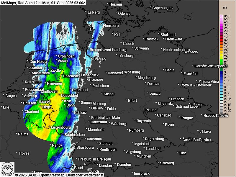 Auch bei unseren Nachbarn in Ostbelgien und Luxemburg kamen 40 bis 60 l/m² zusammen. Nun zieht das Regengebiet über NRW zur Nordsee.