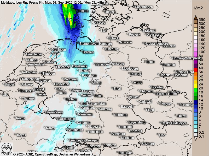 Die 12-Stunden-Regenmengen nach Icon-RUC bis zum Mittag; nach Süden hin sind bis zu den Alpen ein paar Schauer zu erwarten.