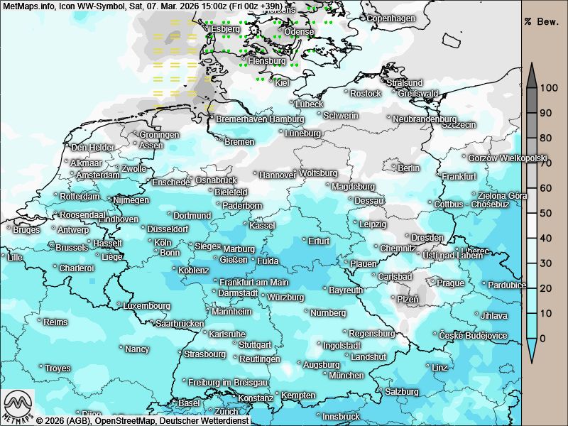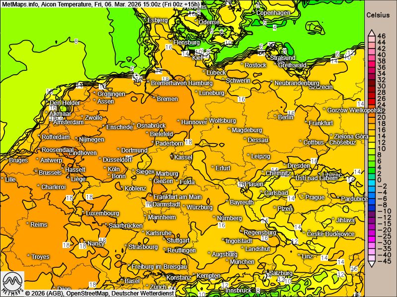 Die Temperaturkarte nach Aicon für Freitagnachmittag (15:00 Uhr) sowie die Wetterkarte nach Icon für Samstagnachmittag (15:00 Uhr):