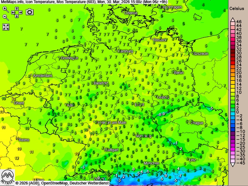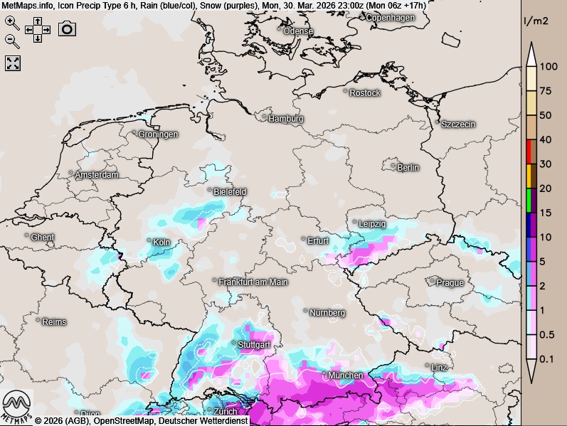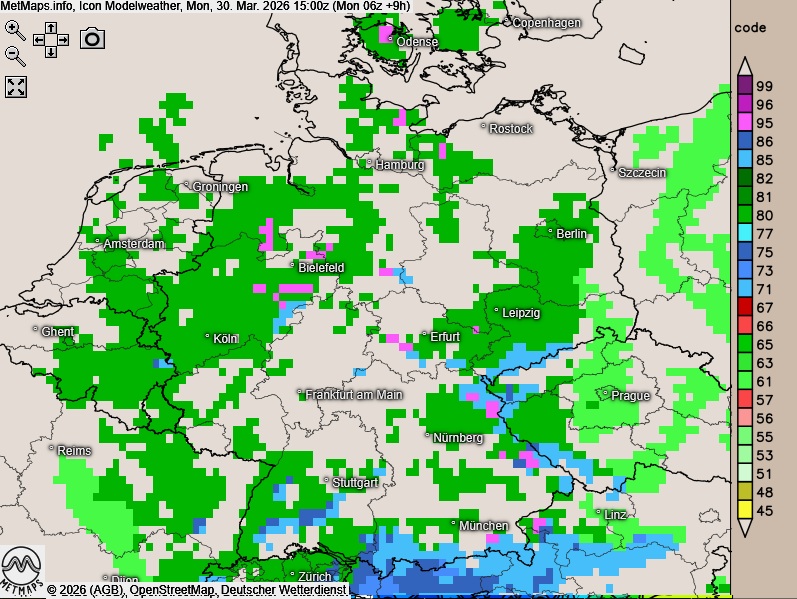 Die Wetter- (Regen grün, Schnee blau) und Temperaturkarte für 15:00 Uhr sowie die Sechs-Stunden-Regen- / Schneemengen bis 23:00 Uhr nach ICON: