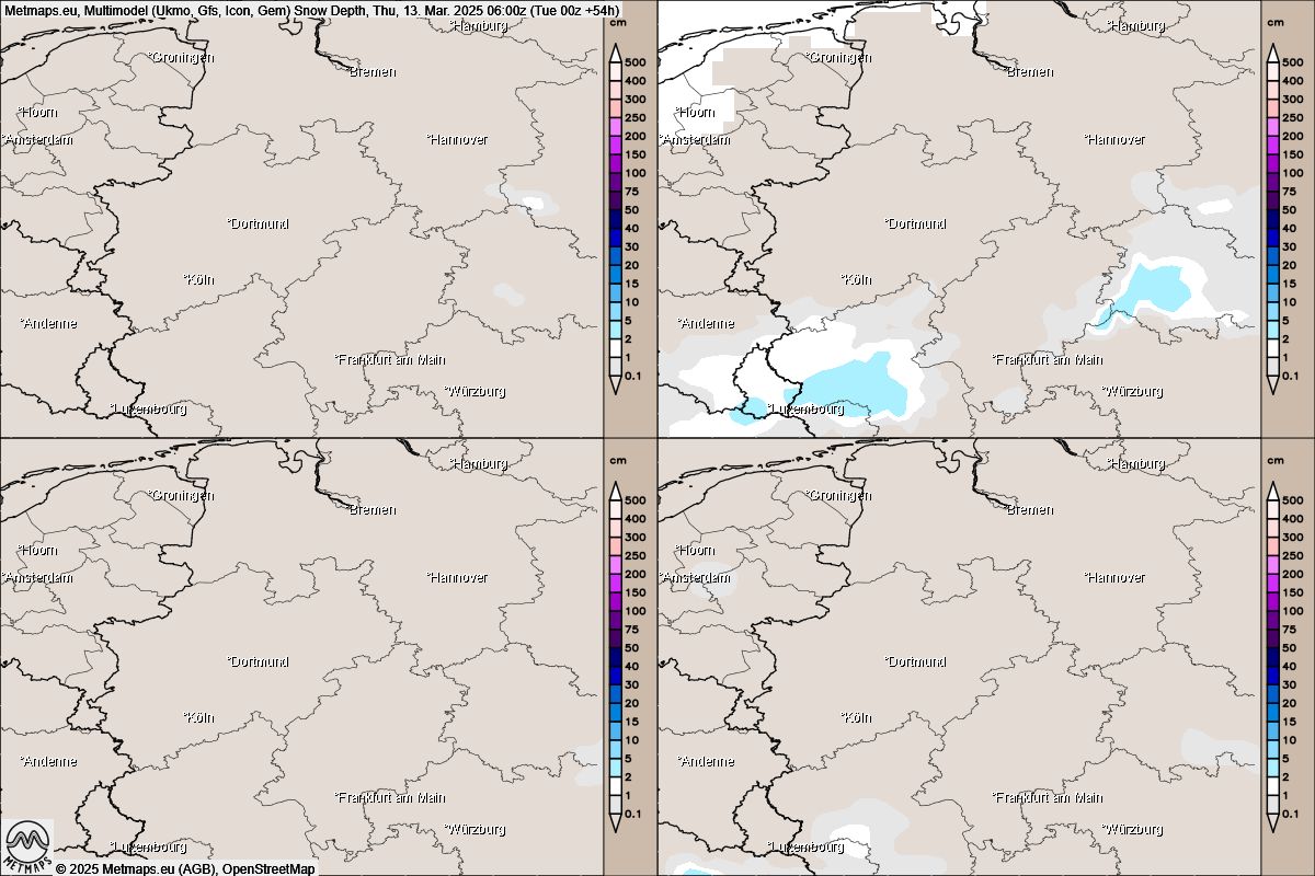 Nachfolgend der GFS-Modelllauf für den Donnerstag für Deutschland sowie vier Modelle mit den jeweiligen Hauptläufen mit Schneehöhe am Donnerstagmorgen.