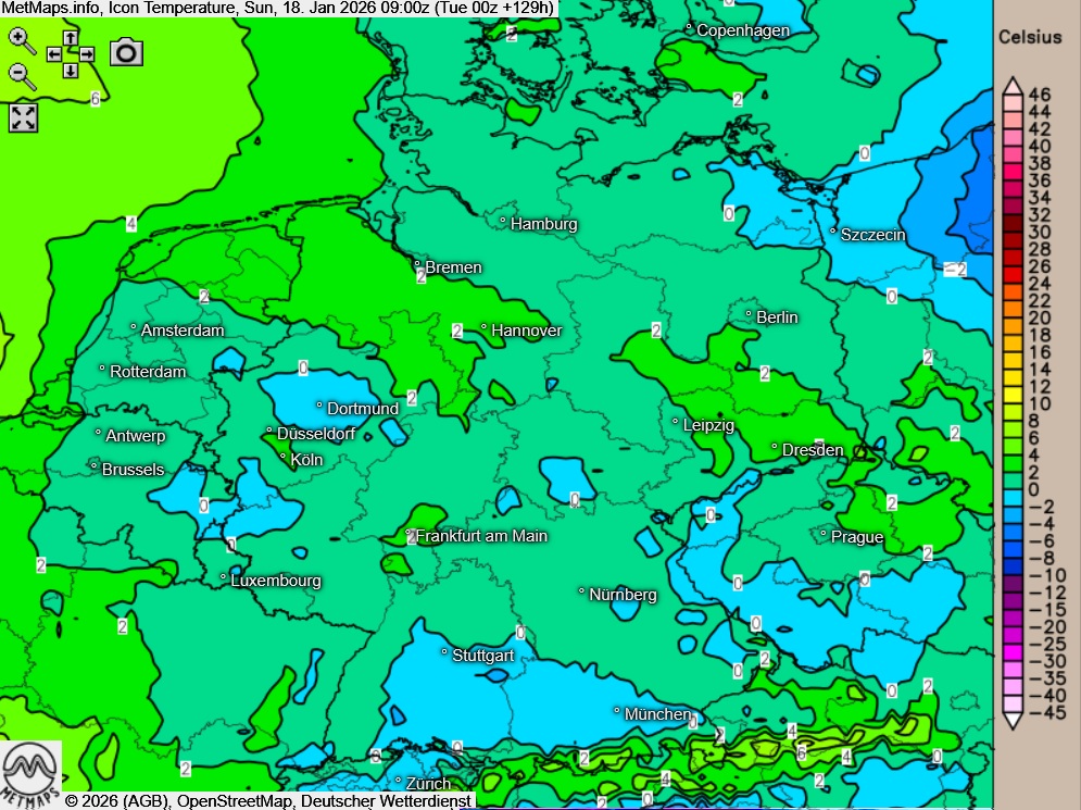 Die Lufttemperaturen nach ICON für Sonntagmorgen (09:00 Uhr):