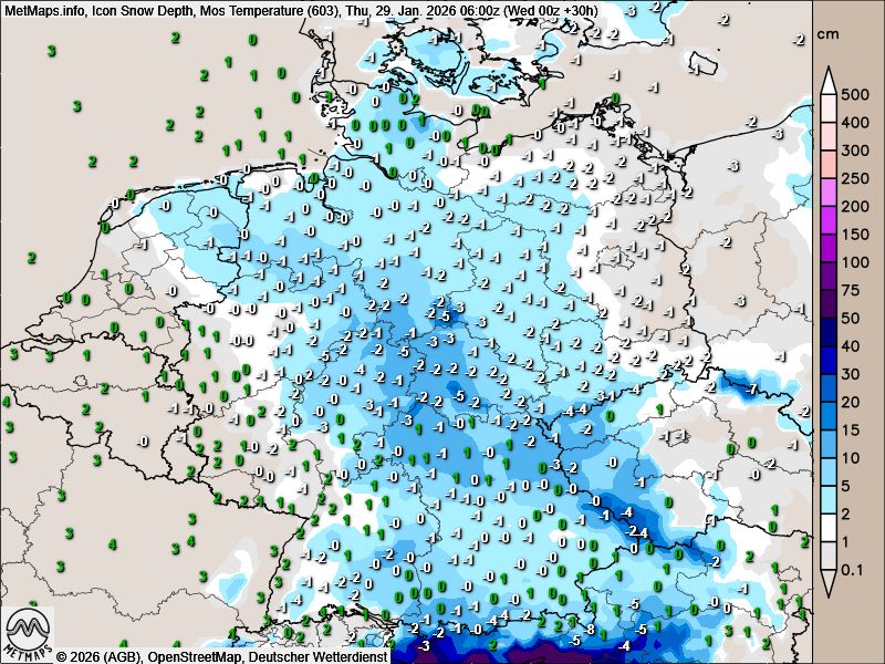 Bis zum Abend sind verbreitet fünf bis zehn Zentimeter Neuschnee möglich, vor allem in Hessen, Niedersachsen sowie in Teilen Bayerns. Lokal können die Mengen je nach Intensität der Niederschläge auch darüber liegen.