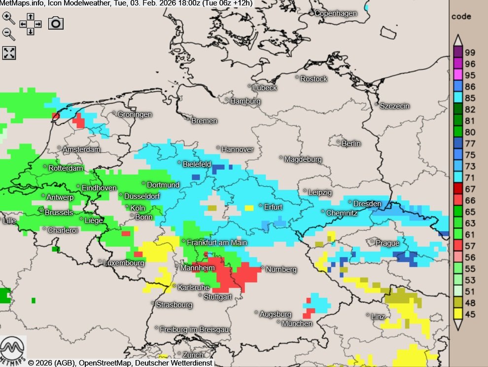 Die Prognosekarten für Dienstagabend (18:00 Uhr) sowie für Mittwoch 00:00 Uhr und 06:00 Uhr