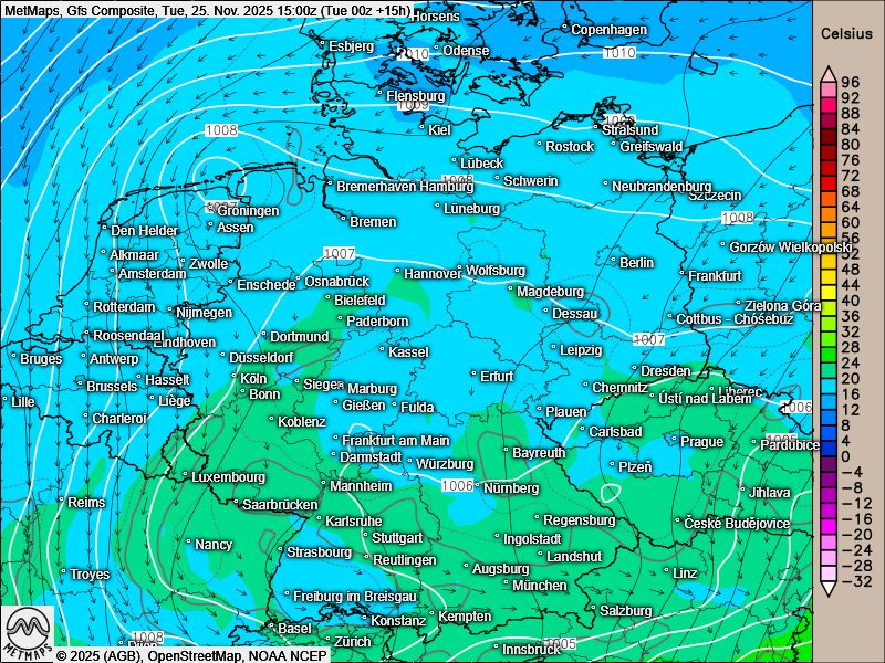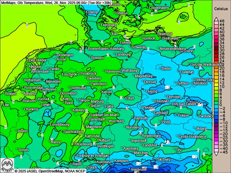 Die Strömungskarte für Dienstagnachmittag (15:00 Uhr) sowie die Wetter- und Temperaturkarte für Mittwochmorgen (06:00 Uhr) nach GFS:
