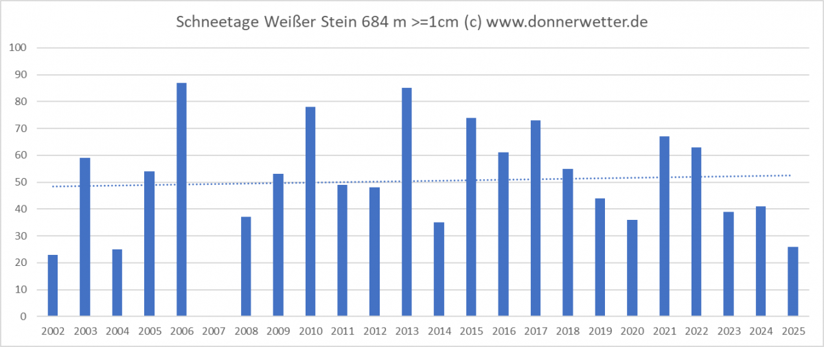 Eine Auswertung der Schneetage – definiert als Tage mit einer Schneedecke von mindestens einem Zentimeter – verdeutlicht jedoch ein differenziertes Bild: Am donnerwetter.de-Wetterpark auf dem Weißen Stein, der auf knapp 700 Metern Höhe liegt, ist die Anzahl der Schneetage seit 2002 auf einem vergleichsweise niedrigen Niveau weitgehend konstant. Eine dramatische Abnahme lässt sich hier statistisch nicht nachweisen.