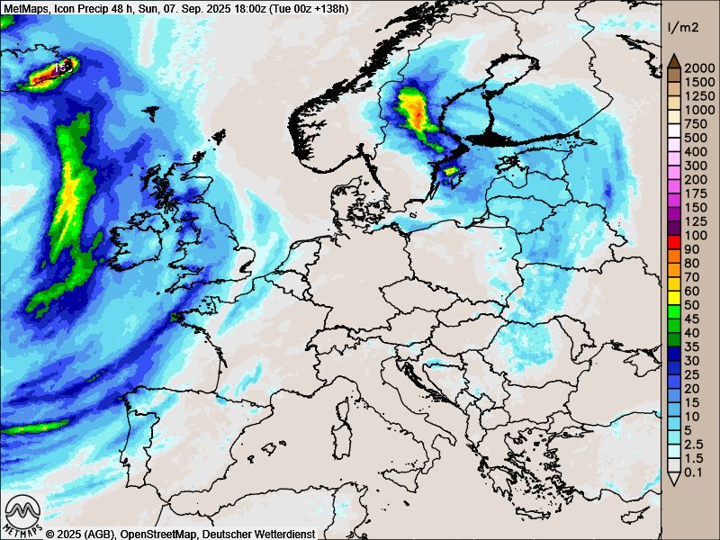 Die Strömungskarte für Samstagnachmittag und die Lufttemperaturen Europa am Sonntagnachmittag nach ICON. Die dritte Karte bildet die akkumulierten 48-Stunden-Regenmengen bis Sonntagabend ab.
