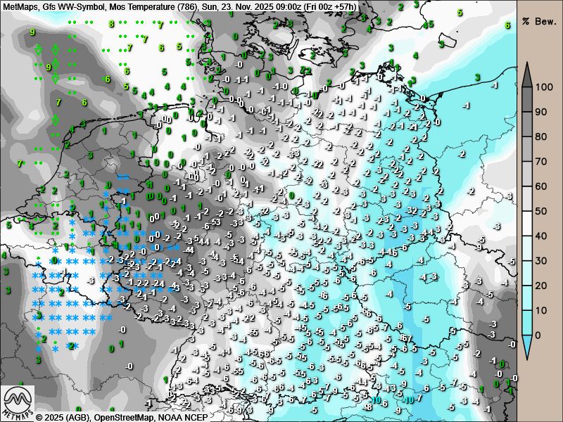 Die Wetter- / Temperaturkarte für Samstagfrüh (06:00 Uhr) sowie für Sonntagmorgen (09:00 Uhr) nach GFS: