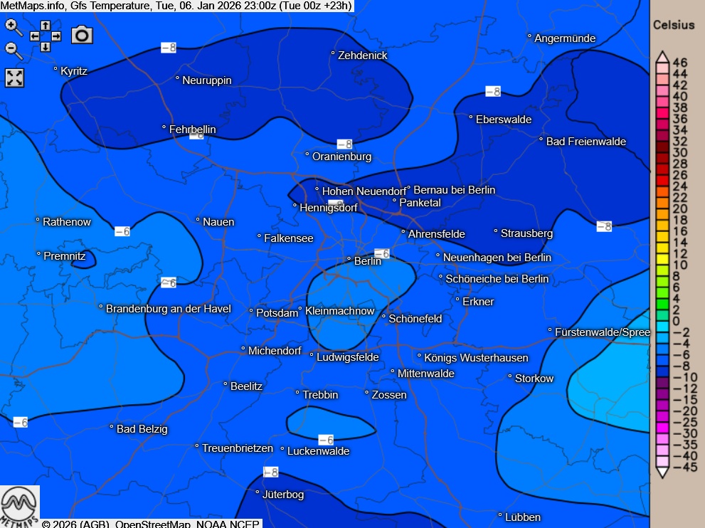 Temperaturkarte Berlin für den späten Dienstagabend
