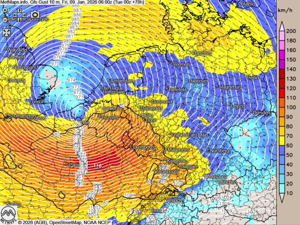 Parallel dazu stellt der Wind ein erhebliches Risiko dar: An der Nord- und Ostseeküste sind Sturmböen bis etwa 100 km/h möglich, in exponierten Lagen sogar darüber. Lokale Spitzen von bis zu 115 km/h können aktuell nicht ausgeschlossen werden.