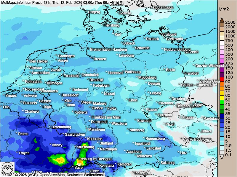 Zudem nehmen die Niederschläge wieder zu - besonders im Südwesten fällt teils ergiebiger Regen: Bis Donnerstag werden im Schwarzwald sowie auf der Schwäbischen Alb verbreitet 30 bis 40 Liter pro Quadratmeter erwartet.