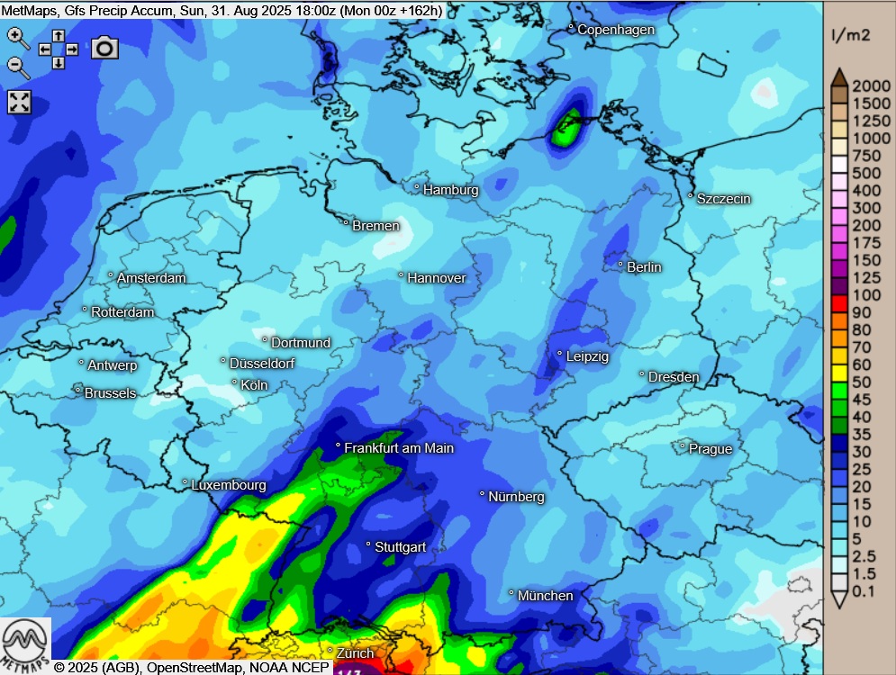 Die Karte zeigt die akkumulierten Niederschlagsmengen bis Sonntag, 31.08. (18 Uhr) nach GFS mit den höchsten Regenmengen im äußersten Süden und Südwesten.