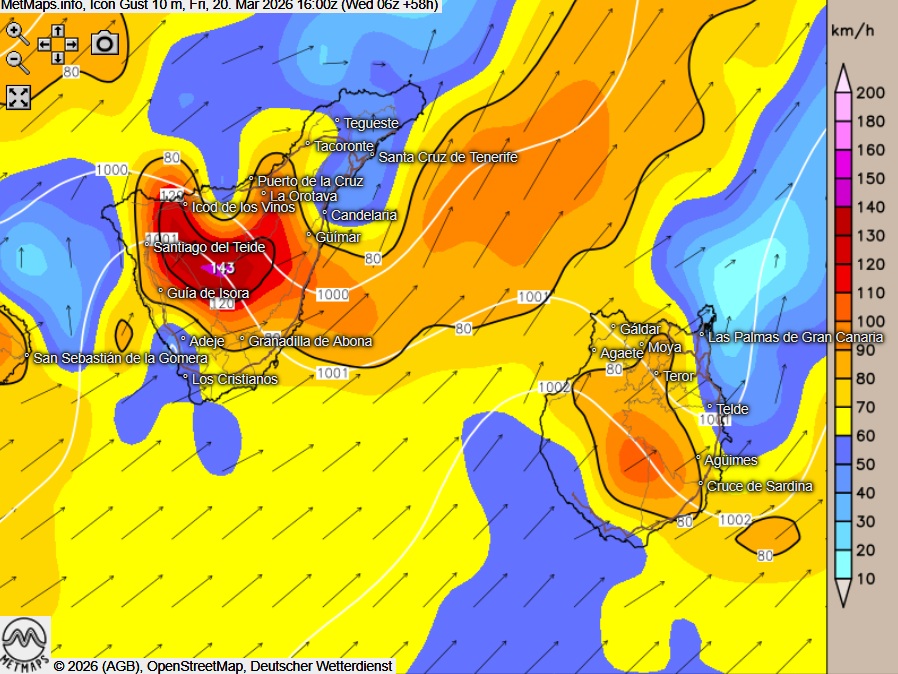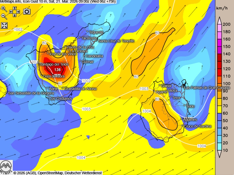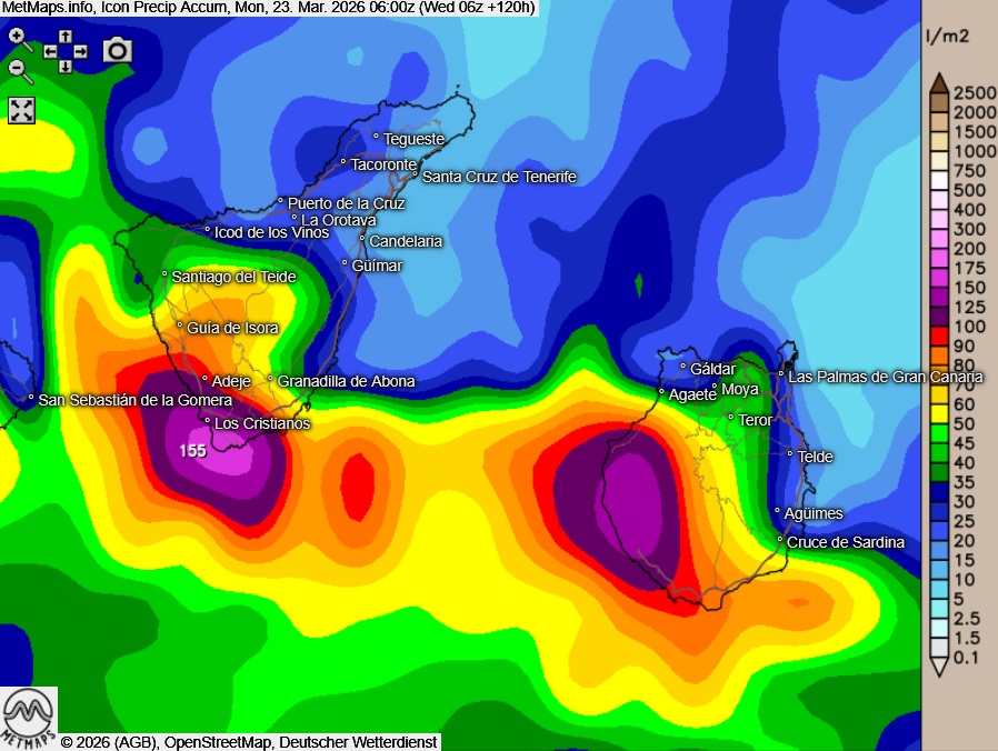 Die Böenkarten für die Kanaren für Freitagnachmittag (16:00 Uhr) und Samstagfrüh (09:00 Uhr) sowie die akkumulierten Regenmengen bis Montagmorgen nach ICON: