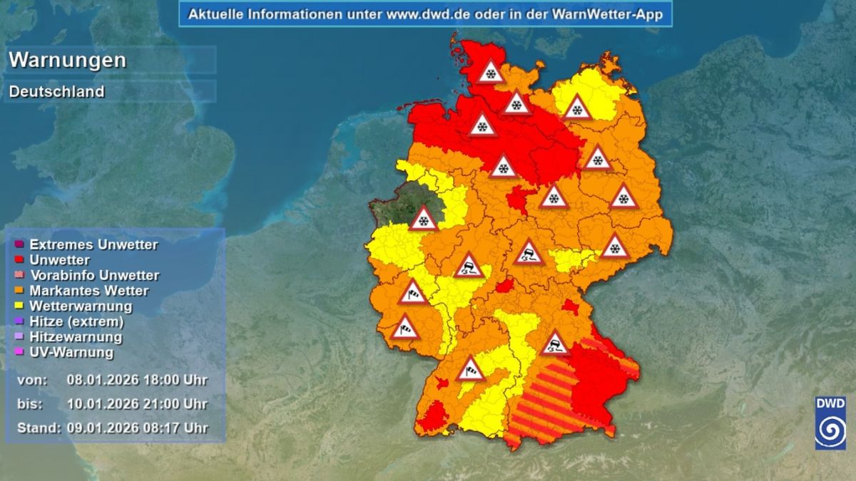 Der Fokus liegt vor allem auf den nördlichen und östlichen Landesteilen: Neben erheblichen Schneemengen (bis zu 15 cm Neuschnee auf einem breiten Streifen von Schleswig-Holstein bis nach Südbrandenburg) sorgen hier zudem starke Böen, Schneeverwehungen und gefrierender Regen für chaotische Zustäde auf den Straßen.