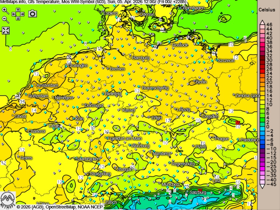 Wetter / Temperaturen an Ostersonntag (12:00 Uhr) GFS