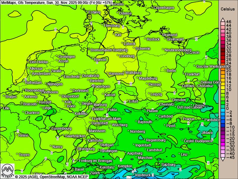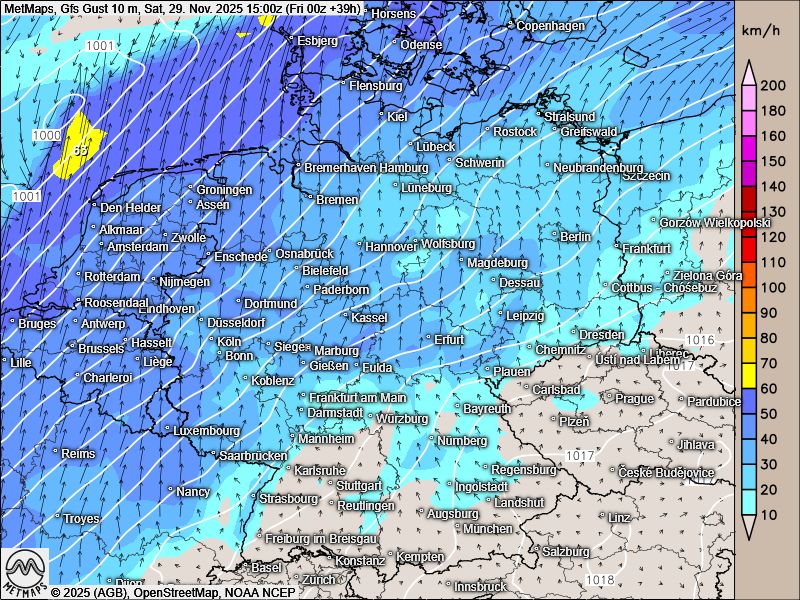 Die Böenkarte (10m) für Samstagnachmittag sowie die Wetter- und Temperaturkarte für Sonntagfrüh nach GFS: