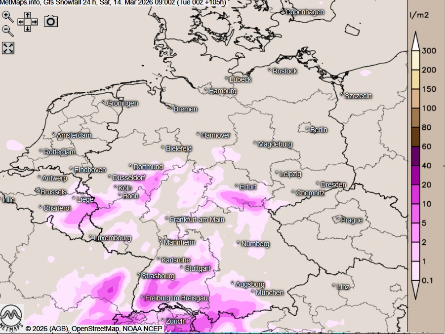 24-Stunden-Schneemengen (GFS) bis Samstag, 09:00 Uhr