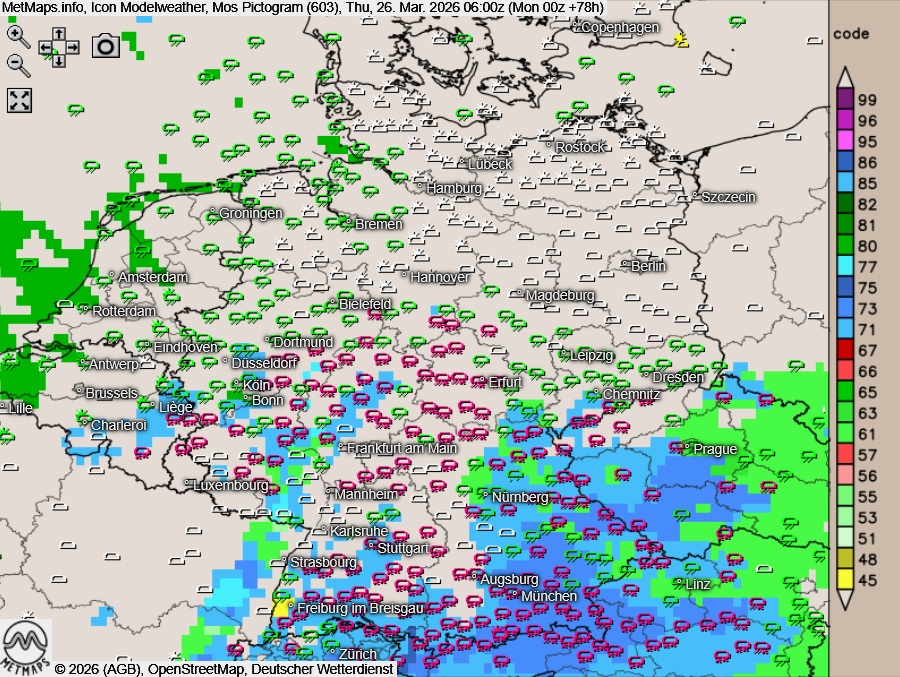 Die Wetterkarte für Donnerstagfrüh (Regen grün, Schnee blau/pink), der vorherrschende Niederschlagstyp bis Donnerstagmittag (12:00 Uhr) sowie die 24-Stunden-Schneemengen für Donnerstag nach ICON: