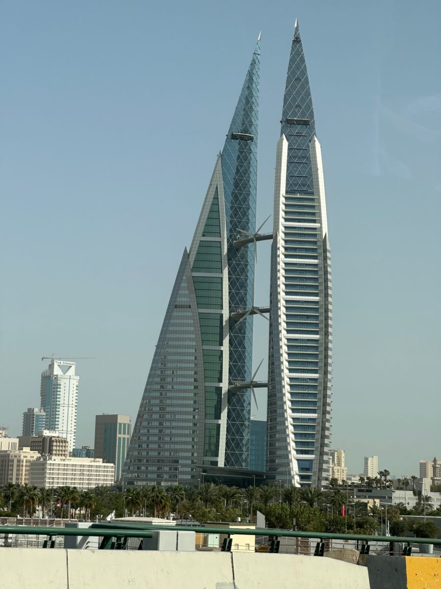 Das Bahrain World Trade Center in Manama gilt als weltweit erstes Hochhaus, das große Windturbinen vollständig in seine Architektur integriert hat.