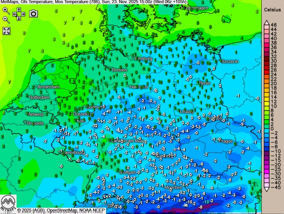 Am Wochenende ist zwar mit ingesamt trockenerem und freundlicherem Wetter zu rechnen, mit den Temperaturen geht es aber noch weiter nach unten: Am Sonntag etwa werden verbreitet nur noch Höchstwerte um den Gefrierpunkt erreicht, im Süden stellt sich Dauerfrost ein.