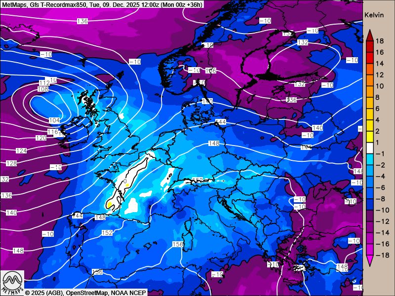 Die Wetterkarten mit der ausgeprägten Wärmephase über Europa, inklusive rekordverdächtiger Werte in der unteren Atmosphäre (850 hPa-Niveau):