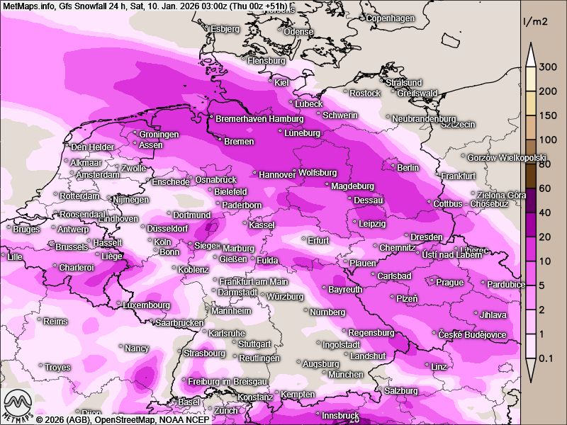 Auch Sachsen-Anhalt, Thüringen und Franken sind betroffen. In den Mittelgebirgen fällt im Tagesverlauf ergiebiger Schnee, teils begleitet von stürmischem Wind. Verkehrsbehinderungen sind wahrscheinlich.