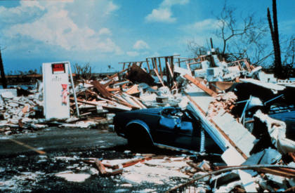 Im Gegensatz zu den Tiefdruckgebieten der Westwinddrift benötigt ein Hurrikane keine Temperaturgegensätze zur Existenz: In einem schwachen Tief entwickeln sich bei labiler Schichtung große Gewitterwolken. Am Boden sinkt der Druck, in der Höhe steigt er, das Tief beginnt zu rotieren. Der Druck fällt am Boden stärker und stärker, während sich im Zentrum des Hurrikane ein Auge aufbaut, in dem die Luft absinkt und abfällt. Der Sturm ist voll entwickelt.